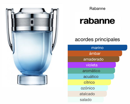 El héroe Rabanne se enfrenta al poder del mar, dominando el desafío entre la intensa frescura de un acorde marino y la fuerte sensualidad de la madera de ámbar.